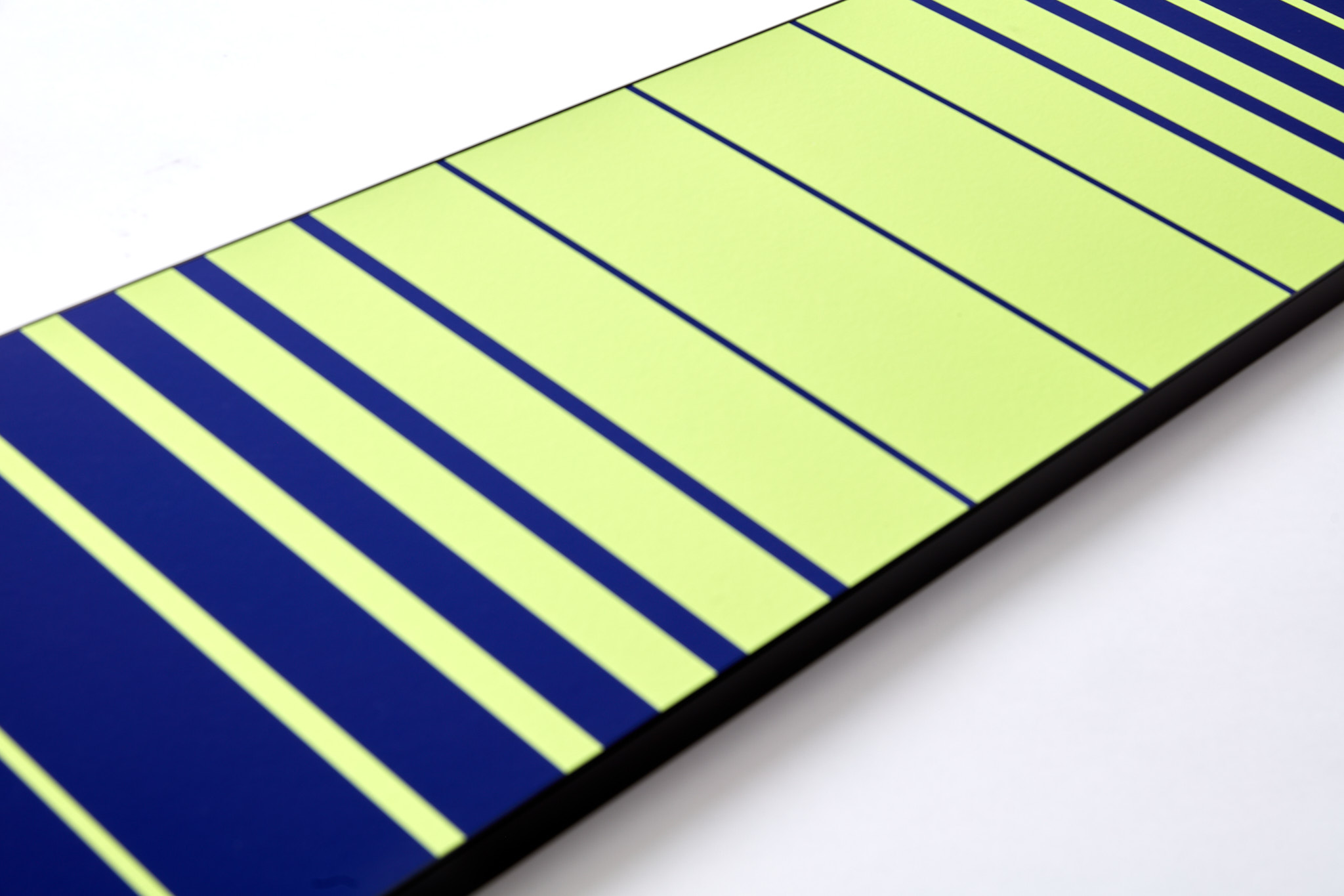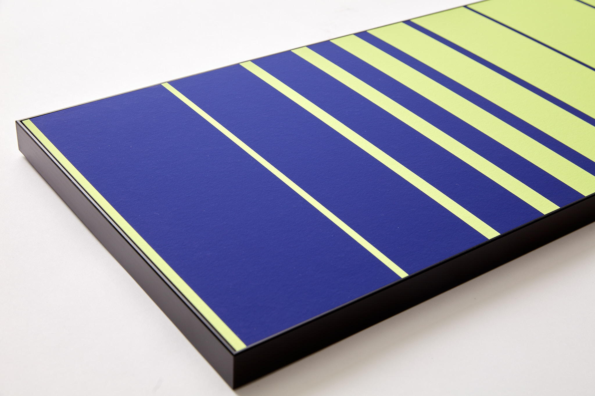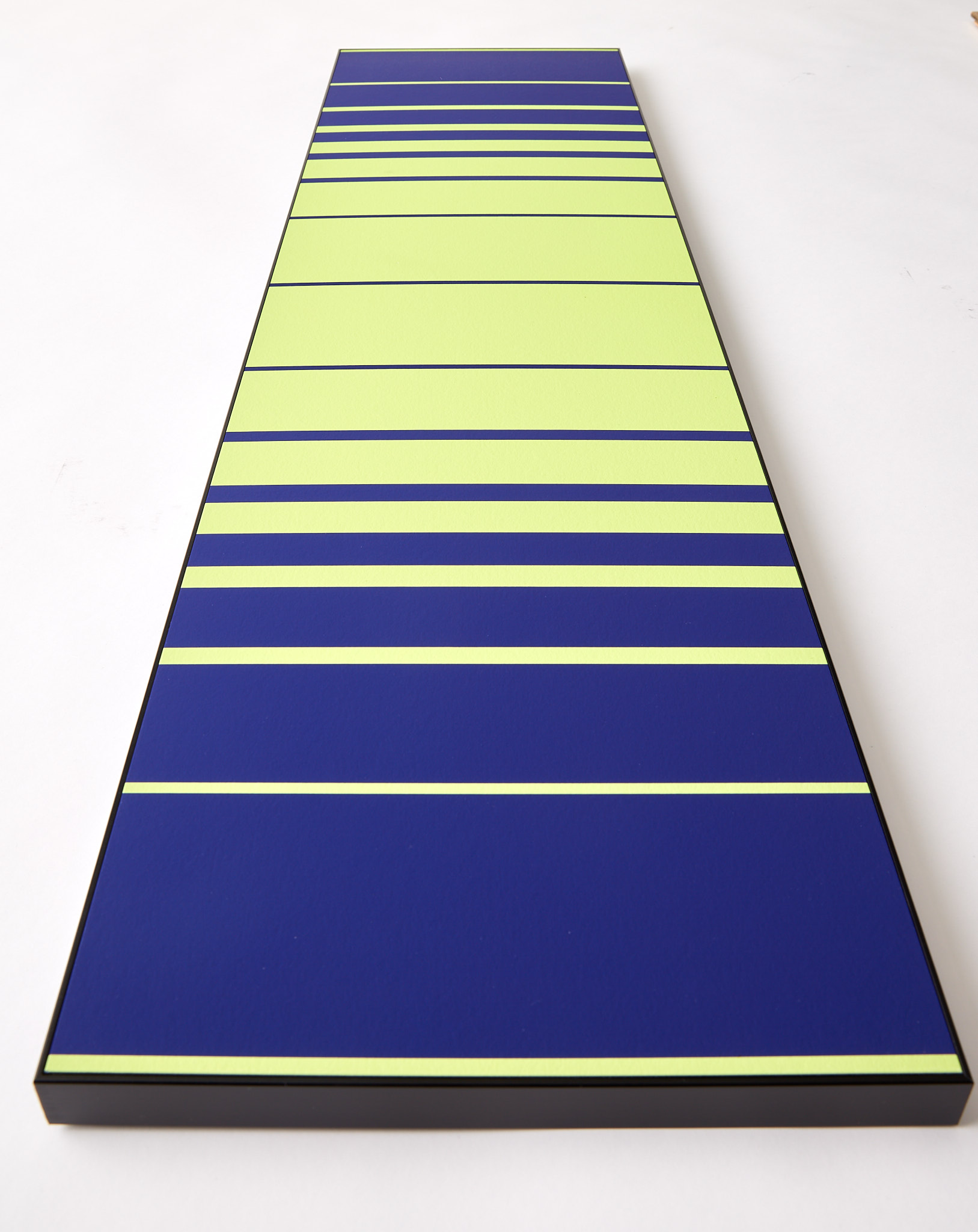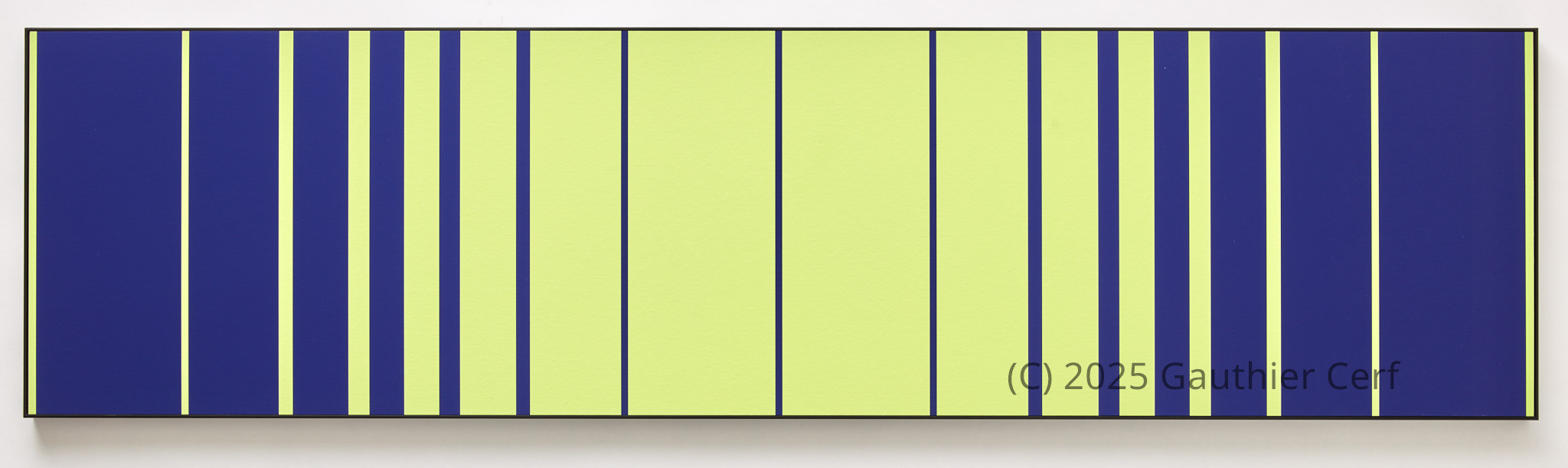 Das Bild ist mittig spiegelsymmetrisch. Von dort verläuft je eine Fibonacci Reihe in Marine-Dunkelblau nach links und nach rechts. Die anderen zwei Reihen sind in Lindgrün gefärbt. Sie verlaufen von aussen (rechts und links) nach innen und treffen sich in der Mitte. Die lindgrünen Streifen bilden die Zwischenräume der Marine-blauen Streifen und umgekehrt.